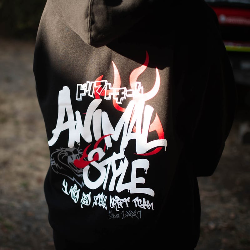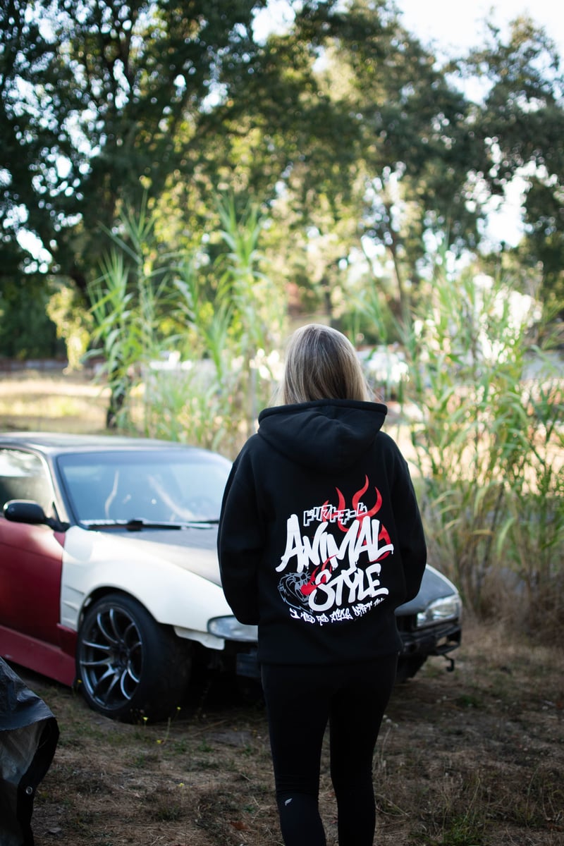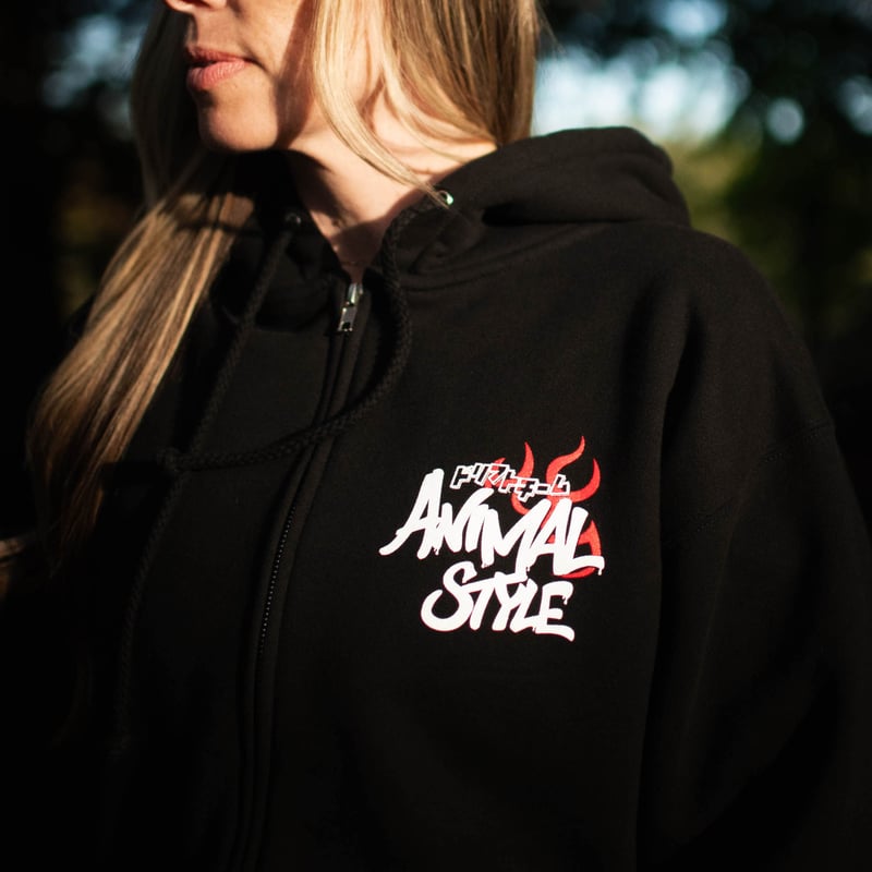 New Wild Red Style print on a black zip hoodie. Midweight, soft and cozy, 80/20 ringspun cotton/poly fleece, #5 metal zipper